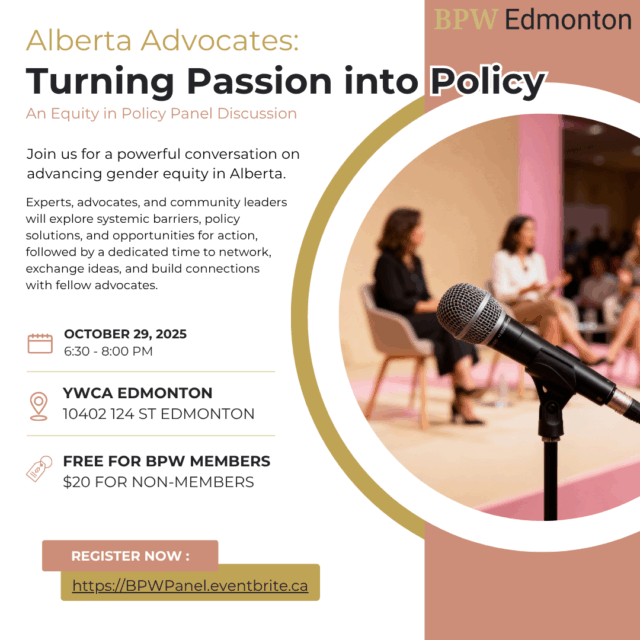 BPW Edmonton’s upcoming panel will bring together experts, advocates, and community leaders to examine how gender equity can be advanced across policy, community, and institutional frameworks in Alberta. The discussion will focus on areas where systemic barriers persist and where targeted policies can create meaningful change. By connecting lived experience, research, and policy perspectives, the panel will explore pressing issues affecting women, girls, and gender-diverse communities, highlighting opportunities for action and collaboration. This event is designed to engage participants in dialogue, raise awareness, and identify practical strategies for advancing equity in Alberta today.